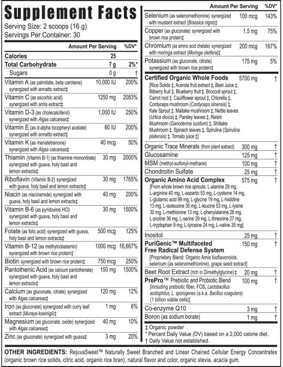 Vitamin A, Vitamin C, Vitamin D-3, Vitamin E, Vitamin K, Thiamin, Riboflavin, Niacin, Vitamin B-6 , Folate, Vitamin B-12, Biotin, Pantothenic Acid, Calcium, Iron, Magnesium, Zinc, Selenium , Copper, Chromium, Potassium, Organic Trace Minerals , Glucosamine, MSM, Chondroitin Sulfate, Organic Amino Acid Complex, Inositol, PuriGenic™ Multifaceted Free Radical Defense System (Proprietary Blend: Organic Amla bioflavonoids, selenium (as selenomethionine), grape seed extract), Beet Root Extract, PrePro™ Prebiotic and Probiotic, Co-enzyme Q10, Boron, RejuvaSweet™ Naturally Sweet Branched and Linear Chained Cellular Energy Concentrates, natural flavor and color, organic stevia, Acacia Gum.