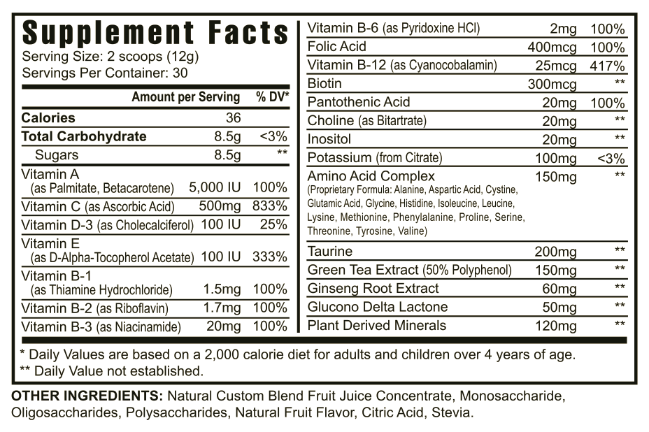 Vitamin A, Vitamin C, Vitamin D-3, Vitamin E, Vitamin B-1, Vitamin B-2, Vitamin B-3, Vitamin B-6, Folic Acai, Vitamin B-12, Biotin, Pantothenic Acai, Choline, Inositol, Potassium, Amino Acid Complex (Proprietary Formula: Alanine, Aspartic Acid, Cystine, Glutamic Acid, Glycine, Histidine, Isoleucine, Leucine, Lysine, Methionine, Phenylalanine, Proline, Serine, Threonine, Tyrosine, Valine), Taurine, Green Tea Extract (50% Polyphenol), Ginseng Root Extract, Glucono Delta Lactone, Plant Derived Minerals. Natural Custom Blend Fruit Juice Concentrate, Monosaccharide, Oligosaccharides, Polysaccharides, Natural Fruit Flavor, Citric Acid, Stevia.