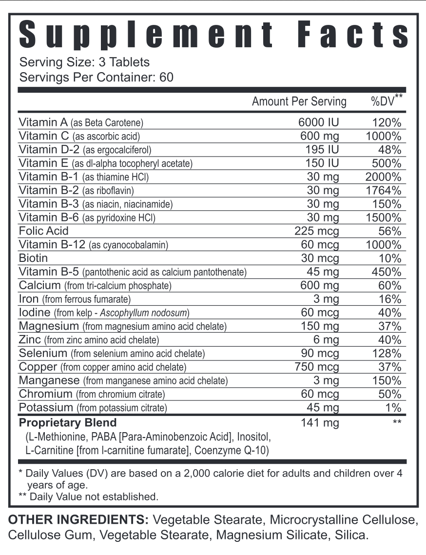 Vitamin A, Vitamin C, Vitamin D, Vitamin E, Thiamin, Riboflavin, Niacin, Vitamin B6, Folic Acid, Vitamin B-12, Biotin, Vitamin B-5, Calcium, Iron, Iodine, Magnesium, Zinc, Selenium, Copper, Manganese, Chromium, Potassium, L-Methionine, Para-aminobenzoic Acid, Inositol, L-Carnitine, Co-enzyme Q-10, Vegetable Stearate, cellulose gum, Microcrystalline cellulose, vegetable stearate, Magnesium silicate, silica.