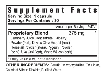 Ingredients: Cranberry Juice Concentrate, Billberry Powder (fruit), Devil’s Claw Extract (root), Horsetail Powder (stem), Pygeum Powder (bark), Uva Ursi (leaf), White Willow (bark), Gelatin, Microcrystalline Cellulose, Colloidal Silicon Dioxide, Purified Water.