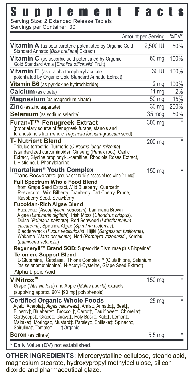 Vitamin A, Vitamin C, Vitamin E, Vitamin B6, Magnesium, Zinc, Selenium, Furan-T™, T- Nutrient Blend, Tribulus terrestris, Turmeric, Garlic Extract, Glycine propionyl-L-Carnitine, Rhodiola Rosea Extract, L Histidine, L-Phenylalanine Imortalium® Youth Complex, Trans Resveratrol, Full Spectrum Whole Food Blend from Grape Seed Extract, Wild Blueberry, Qu