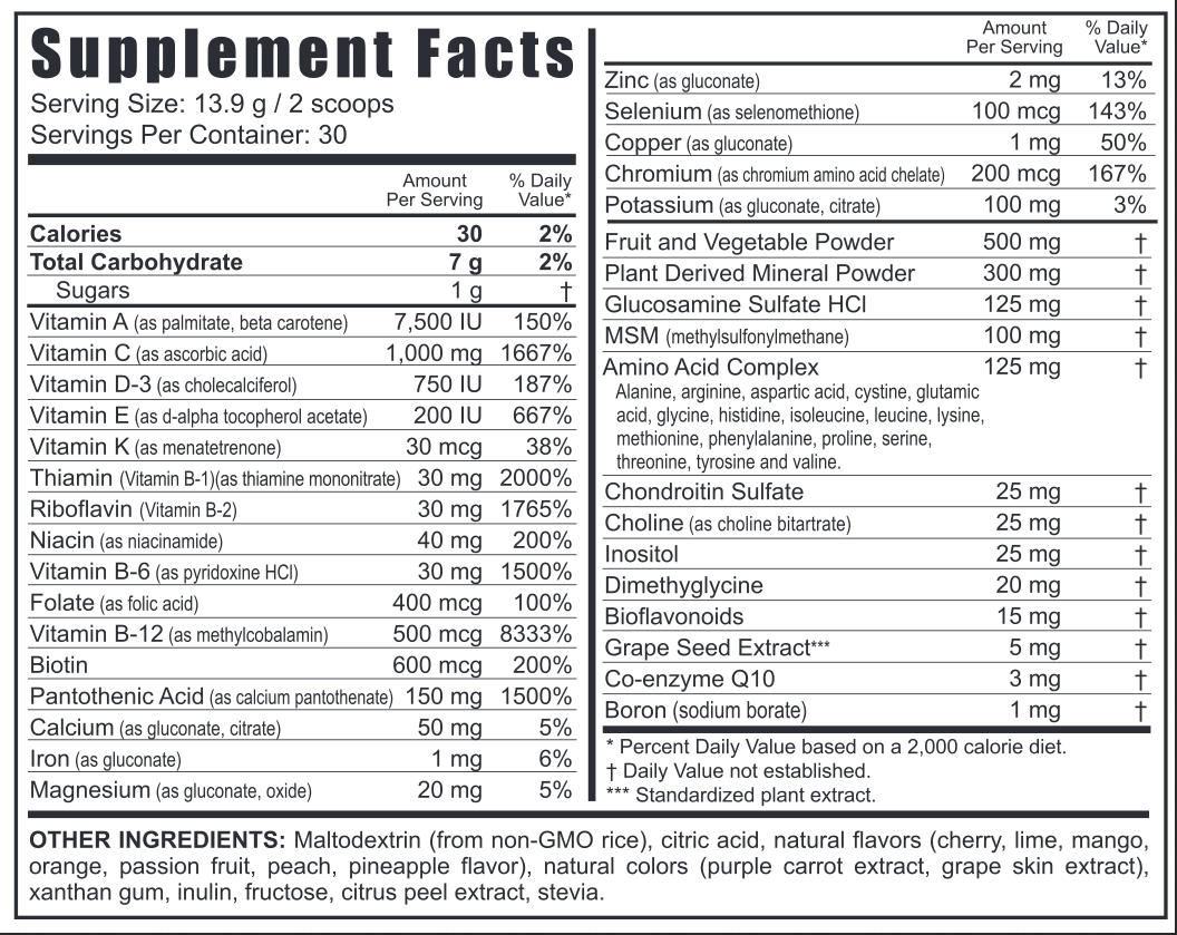 Vitamin A, Vitamin C, Vitamin D-3, Vitamin E, Vitamin K, Thiamin, Riboflavin, Niacin, Vitamin B-6, Folate, Vitamin B-12, Biotin, Pantothenic Acid, Calcium, Iron, Magnesium, Zinc, Selenium, Copper, Chromium, Potassium, Fruit and Vegetable Powder, Plant Derived Mineral Complex, Glucosamine HCl, Amino Acid Complex (alanine, arginine, aspartic acid, cystine, glutamic acid, glycine, histidine, isoleucine, leucine, lysine, methionine, phenylalanine, proline, serine, threonine, tyrosine and valine), MSM, Chondroitin Sulfate, Choline, Inositol, Dimethyglycine, Bioflavonoids, Grape Seed Extract, Co-enzyme Q10, Boron, Maltodextrin, citric acid, natural flavors (tangerine, orange, cherry, lime, mango, passion fruit, peach, pineapple), natural colors (beet juice, radish, apple, blackcurrant, purple carrot), fructose, frutooligosaccharides, pea protein, xanthan gum, stevia, sodium ascorbate, gallic acid, guar gum, ellagic acid.
