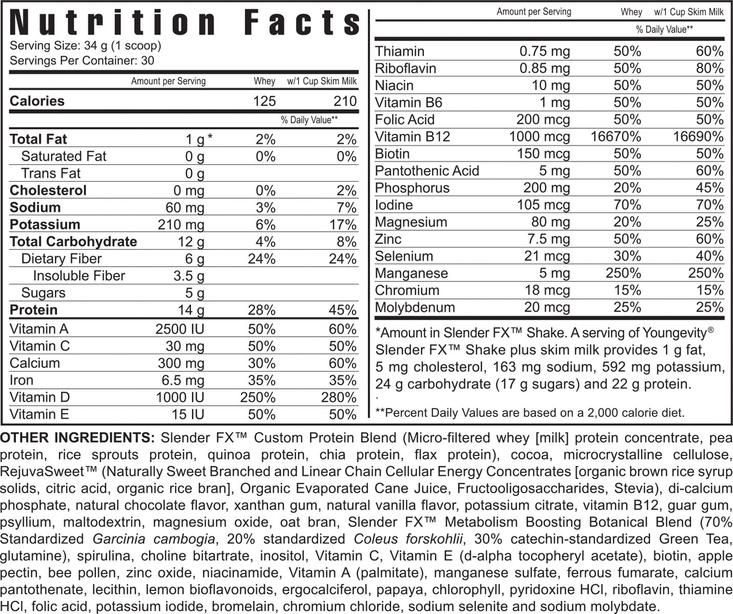 The revamped Chocolate Fudge Slender Fx™ Meal Replacement Shake is Soy-Free and Gluten-Free! With a delicious, creamy vanilla flavor and 125 calories per serving, it delivers a wide spectrum of vitamins minerals and other nutrients to support sustained levels of physical mental and emotional energy throughout the day. Combine with the fruit and liquid of your choice for a delicious full-flavoured thick milkshake-style drink.