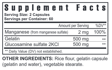 Manganese, Gelatin, Glucosamine Sulfate 2KCI, Rice Flour, Gelatin Capsules, Vegetables Stearate.